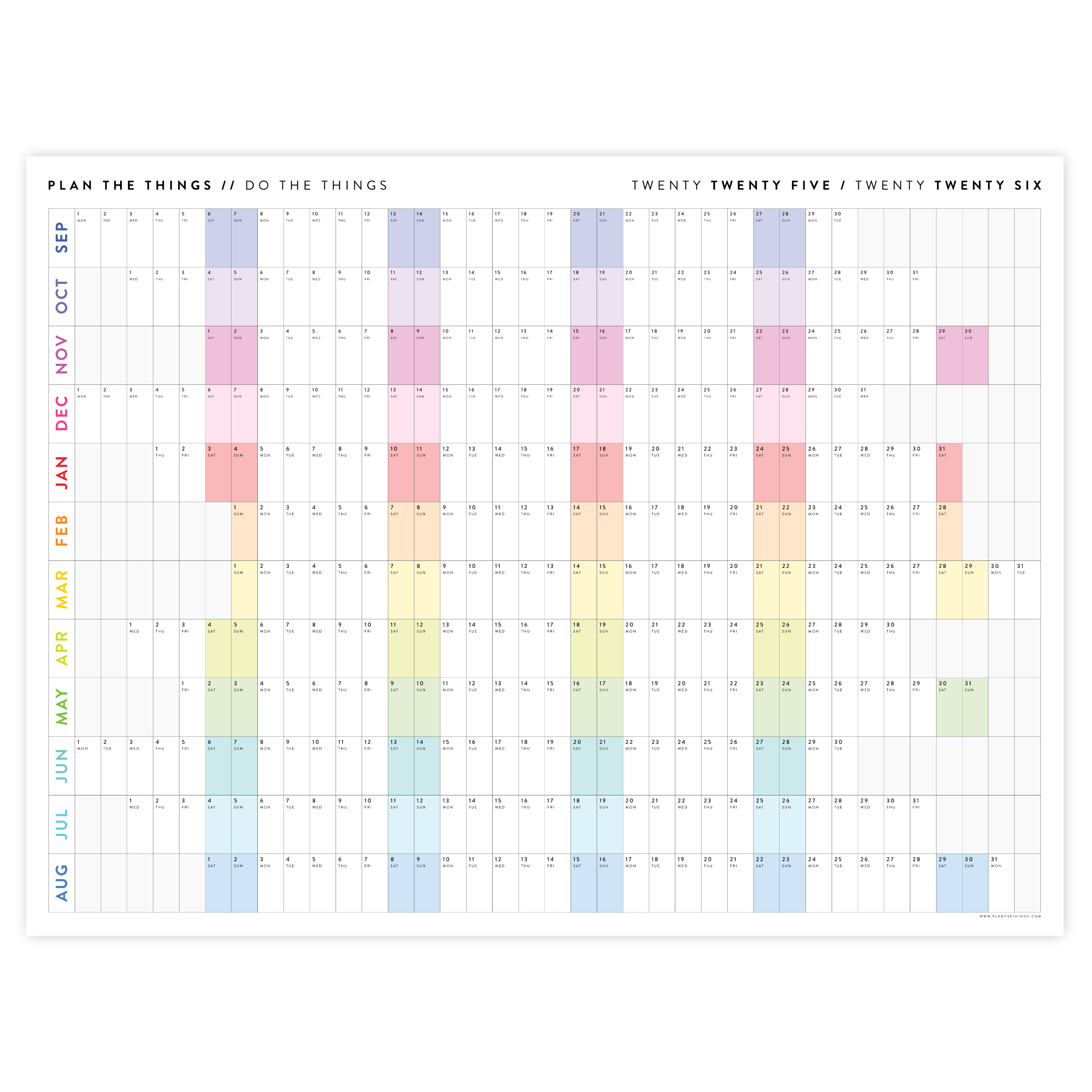 Ready to plan the next year starting in September 2025 and running through to August 2026? This super-functional, minimalist wall calendar comes in three sizes, 24" x 18" (medium), 32" x 24" (large) and 40" x 30" (giant) so that you see everything you have going on in 2026 in one (long) glance.
