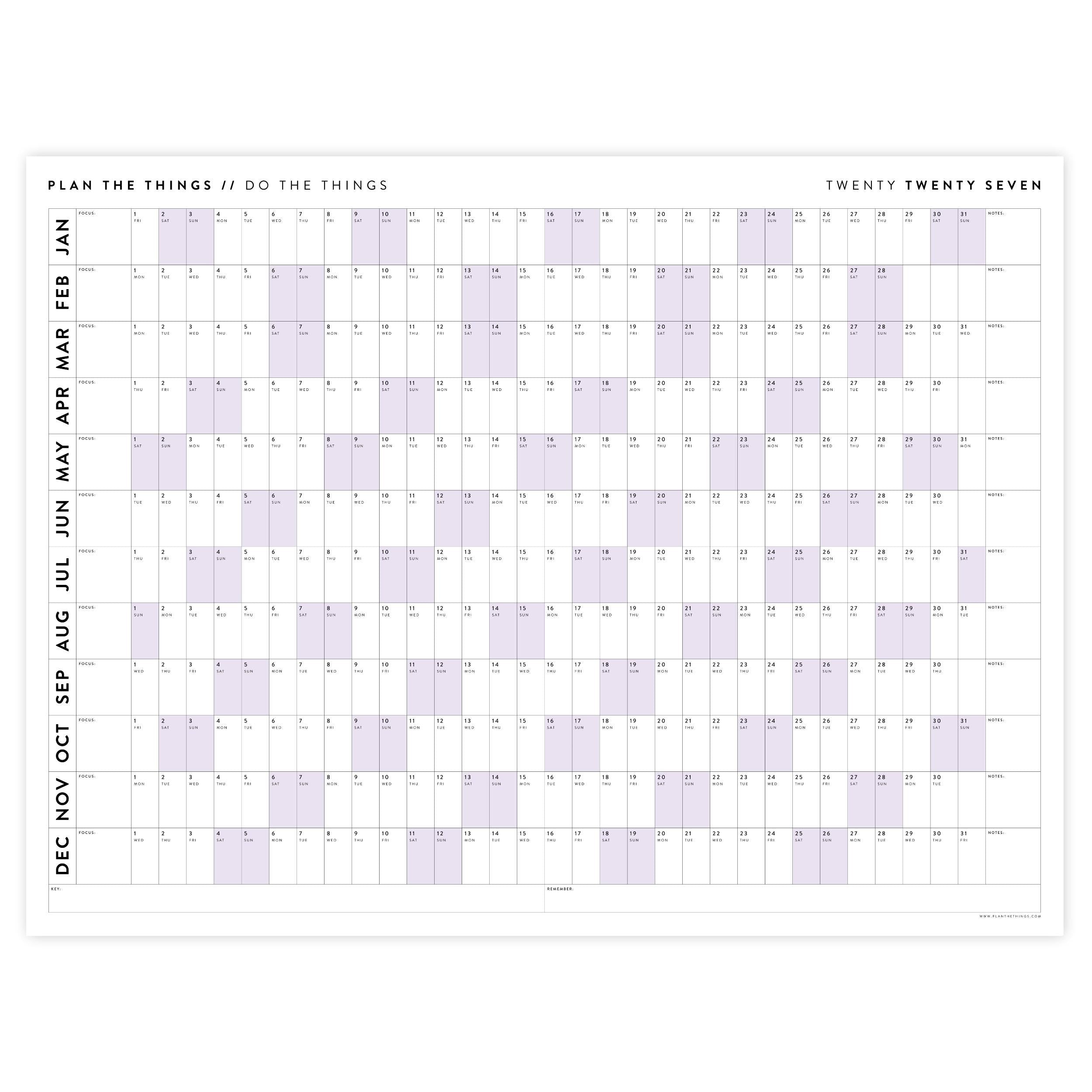 PRINTABLE 2027 HORIZONTAL WALL CALENDAR - PURPLE WEEKENDS - INSTANT DOWNLOAD